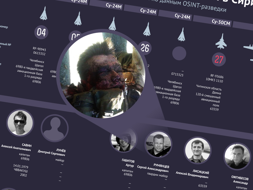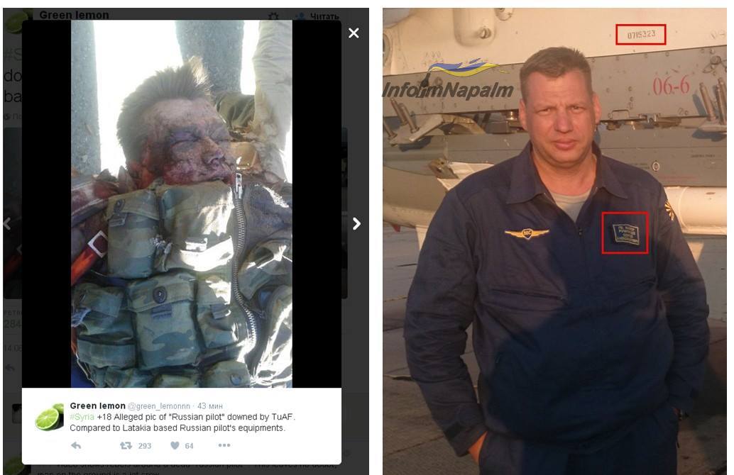 По техни данни загиналия авиатор е гвардейския майор – пилот на изтребител „Су-24“ със заводски номер 0715323 от 6980-а гвардейска авиационна база към 1-ва ескадрила на военното поделение 69806, съобщи informnapalm.org, цитирайки свои източници от Сирия.