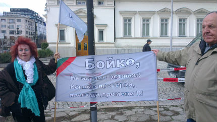 Цели 30 души се събраха днес пред сградата на Народното събрание на протест в подкрепа на Бойко Борисов и всички министри в оставка. Те заявиха, че не са членове на ГЕРБ, а са излязли спонтанно, като са се уговорили още в четвъртък на обед, когато около парламента рипаха овцете и прасетата и циганите с гайдите. Протестиращите нямали и конкретни искания, просто били доволни от кабинета и искали да се върне. Всичките 30 демонстранти отрекоха някой да ги е накарал да отидат там или да им е платил.
