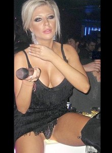 Тя се е навела и бюстът й се държи на магия от сутиена , а зърната почти са изскочили. Най-вероятно е искала феновете да изпаднат в захлас от „пъпешите“ й и да изръкопляскат, но вместо ръкопляскания, отзивите са, че пъпешите са малко попрезрели. Те наистина висят със страшна сила, не само заради земното притегляне, но и заради многото силикон, който най-вероятно се е амортизирал.