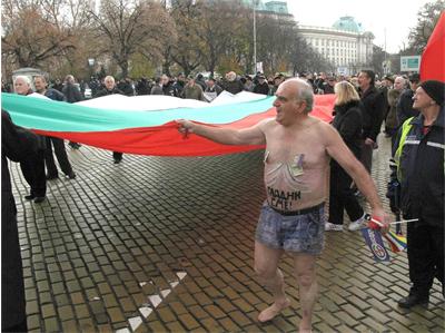 Около сто души – пенсионери, протестираха днес пред сградата на Народното събрание. Един от тях се отличи от тълпата, защото се съблече гол, а на корема му се мъдреше надпис „Гладни сме!”.