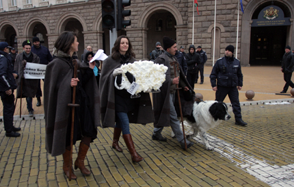 Седем представители на различни университети, облечени с ямурлуци и въоръжени с геги, разходиха овца от стериопор на име Меглена Кунева, която бе пазена от куче от любимата на премиера каракачанска порода.