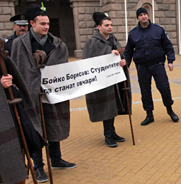 Доброволци от партията на Меглена Кунева изиграха артистична сцена пред сградата на МС, посветена на предстоящия студентски празник. Седем представители на различни университети, облечени с ямурлуци и въоръжени с геги, разходиха овца от стериопор на име Бойка, която бе пазена от куче от любимата на премиера каракачанска порода. Представлението спря много минувачи, а артистичната група си водеше и публика, която ръкопляскаше. Студентите протестираха по този необичаен начин преди празника си в тон с призива на премиера, че младите вишисти не бива да се оплакват, че са безработни, когато има свободни места за овчари. Във Варна той пък се изцепи пред академичната общност, че не всички могат да са студенти, някои са за овчари. Стоян Нешев, който е студент по журналистика, коментира, облегнат на гегата си, че в една страна, чиято образователна политика е овча, 8 декември трябва да се празнува с ямурлуци и геги. Той подчерта, че висшето образование в момента е станало развлекателен бизнес, студените се превръщат в клиенти и никой не закрива дискотеките, клубовете и чалгарниците, които пречат на младите хора да учат. В България се отделят повече пари за подслушване, отколкото за образование, заяви студентът, а благодарение на овчата политика на правителството младите хора се поощряват към безделие и агресия, вместо към учене. Според протестиращите, овцата Бойка била и символ на овчедушието на управляващите спрямо проблемите на учещите младежи. Досег единствената промяна в образованието била вкарването на Бойко Борисов в учебниците по история. Полицаите се намесиха и накараха младежите да се изтеглят от района на Министерския съвет.